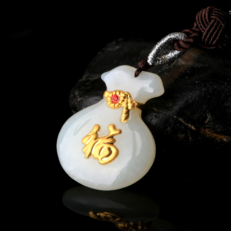 金镶玉有福福袋吊坠★和田玉镶足金福字有财钱袋项链