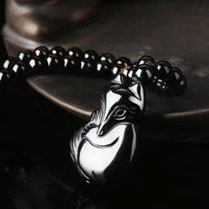 天然黑曜石桃花狐狸项链吊坠★黑曜石全珠