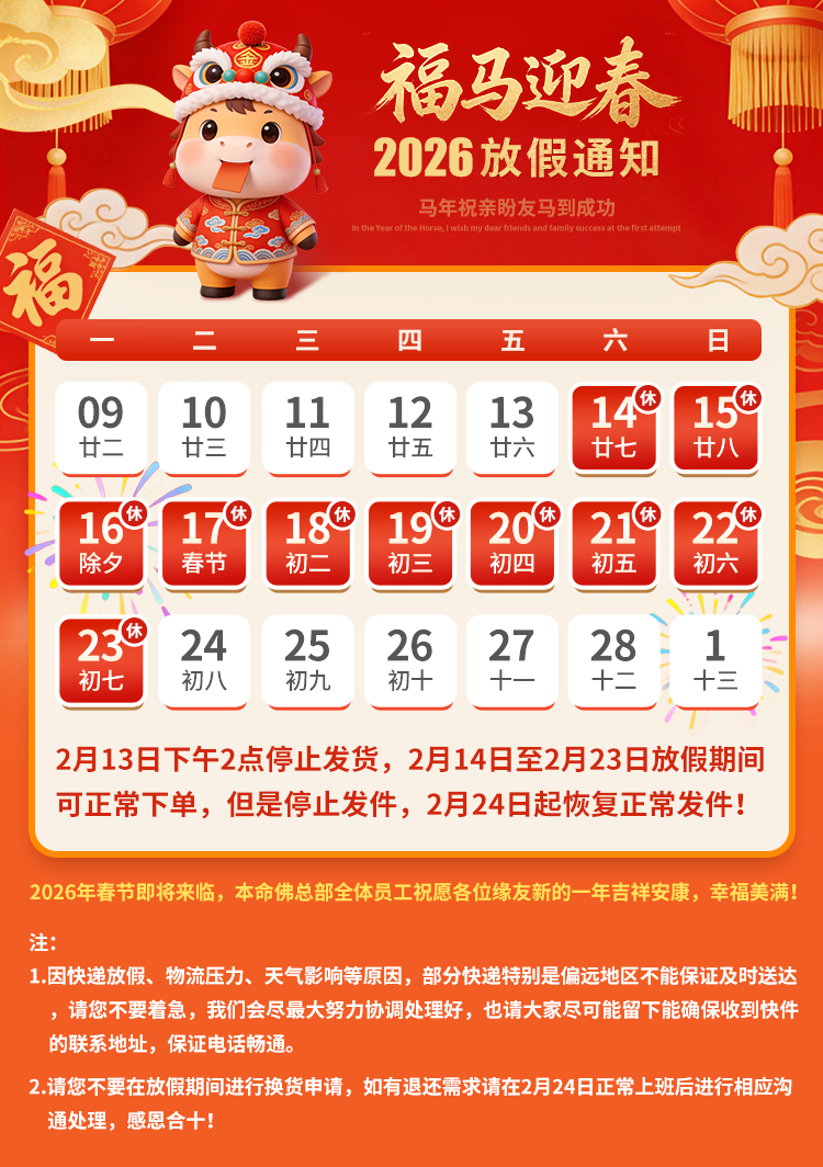 缘友您好,本命佛总部于2月14日(腊月二十七)至2月23日(正月初七)春节放假,2月24日(正月初八)正常上班。年前发件截止2月13日下午14时,放假期间可以正常下单,将于2月24日正常上班后安排发出。因放假期间无人值守,如需查件可登录会员中心-订单管理,或直接点击这里快捷查件,可以根据单号联系快递公司,由此给您带来的不便,向您表示歉意!