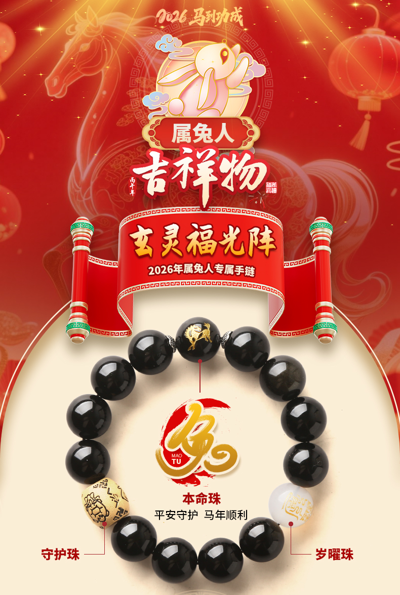 属兔人2026年马年生肖吉祥物手链男款★玄灵福光阵★黑玛瑙茶晶沉香紫檀木多款本命年犯太岁
