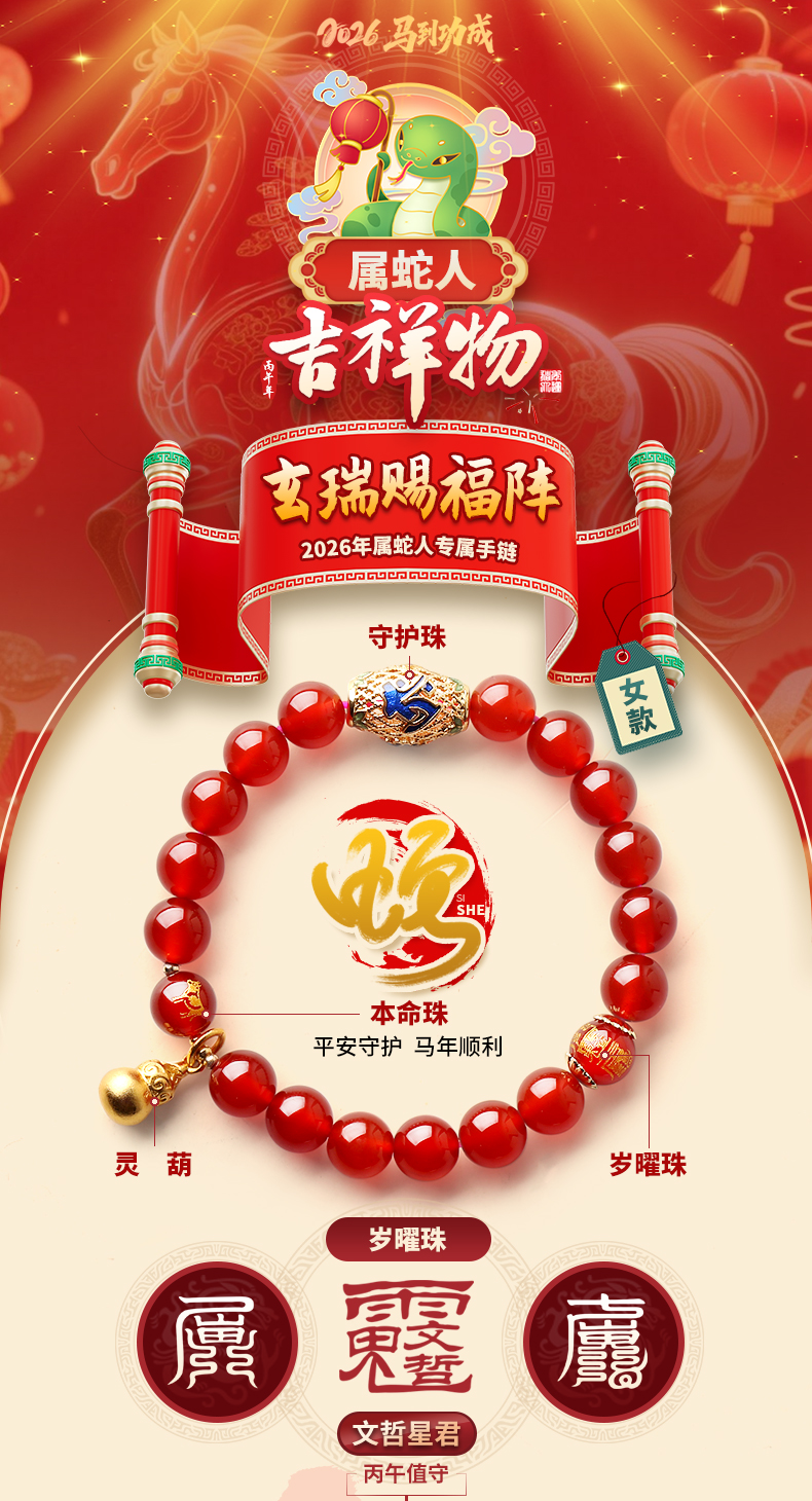属蛇人2026年马年生肖吉祥物手链女款★玄瑞赐福阵★红玛瑙紫水晶朱砂沉香多款本命年犯太岁
