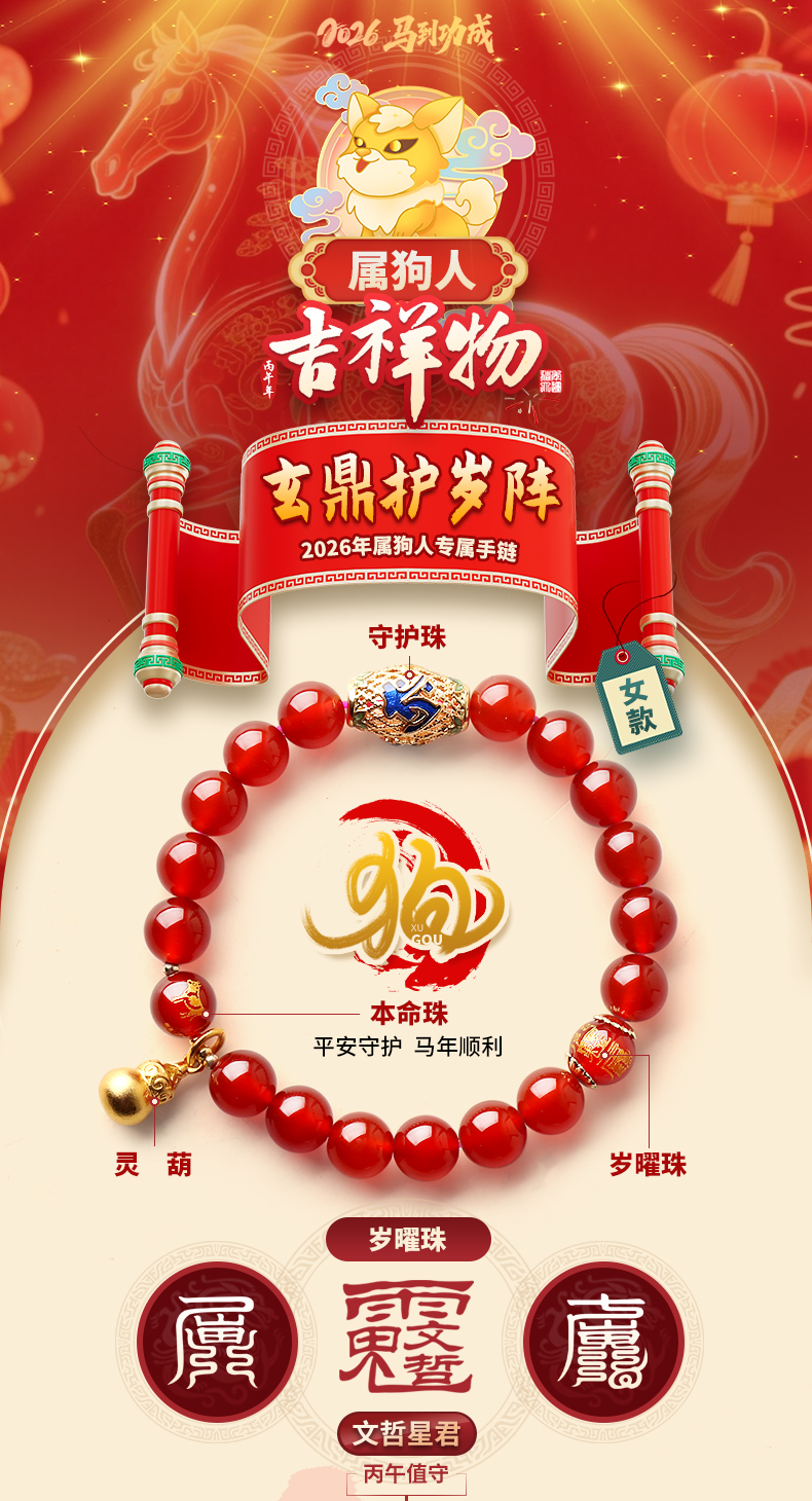 属狗人2026年马年生肖吉祥物手链女款★玄鼎护岁阵★红玛瑙紫水晶朱砂沉香多款本命年犯太岁