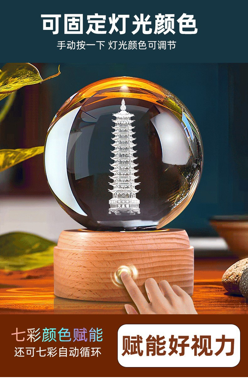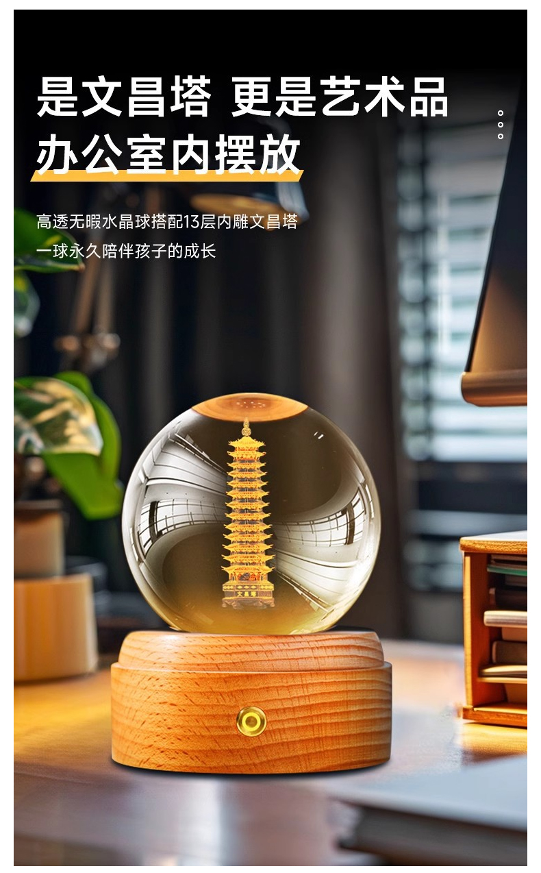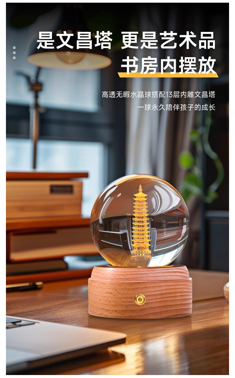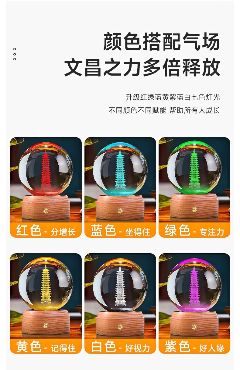 文昌塔水晶球音乐盒摆件★七彩13层学生用发光底座白色水晶书桌摆件